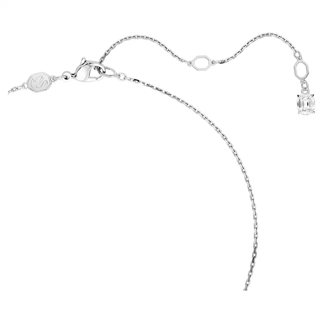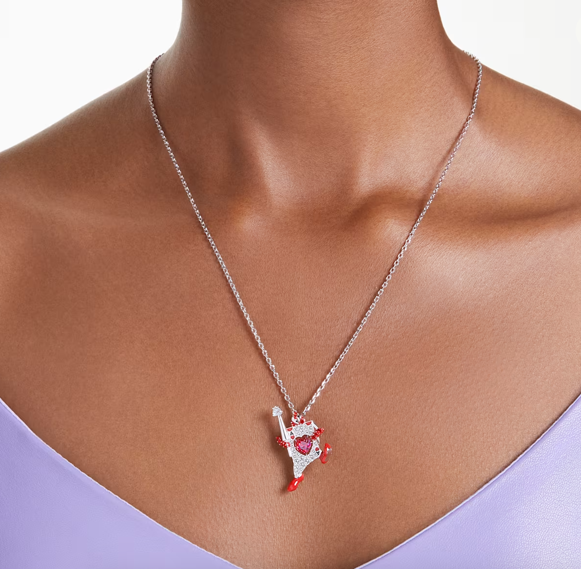 Swarovski pendant celebrates Disney's classic tale Alice in Wonderland Collection, offering joyful styling. The rhodium-plated design showcases an animated playing card, adorned with vibrant red and clear crystals. A dancing heart-shaped Swarovski Zirconia is centrally featured, enhancing its intricate detail. This exquisite piece is worn on a delicate chain, extended by a single Swarovski Zirconia.