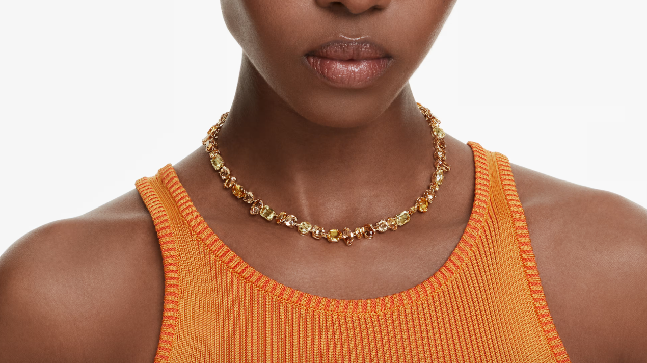 Swarovski luminous gold-tone plated necklace enhances any ensemble with its vibrant appeal. Featuring an all-around design, it is adorned with meticulously prong-set crystals in a dramatic mix of yellow and amber tones. The piece exemplifies the Gema collection's unique formations and inherent beauty. It complements other jewelry from the family for a cohesive and brilliant look.
