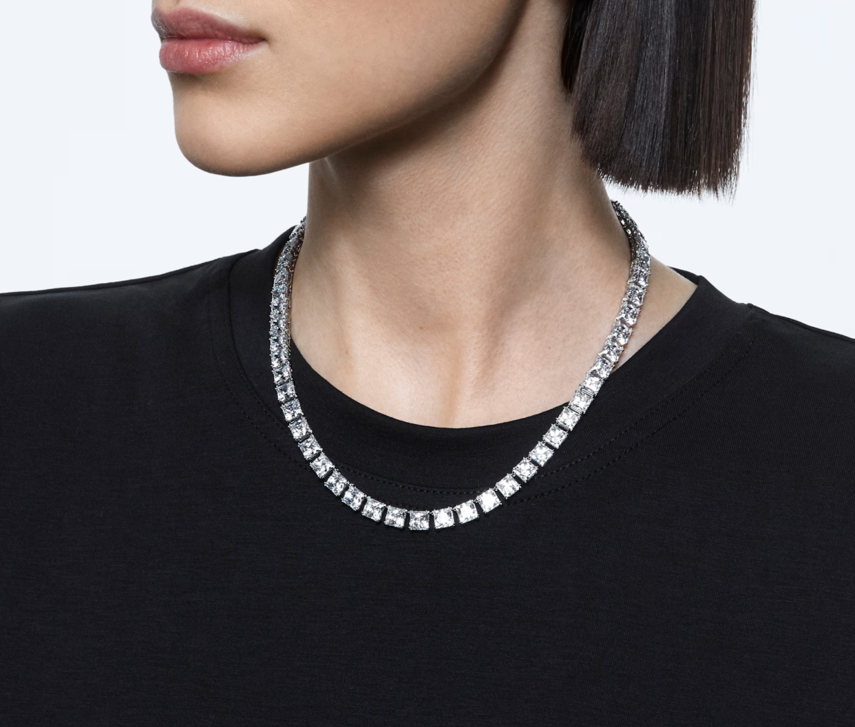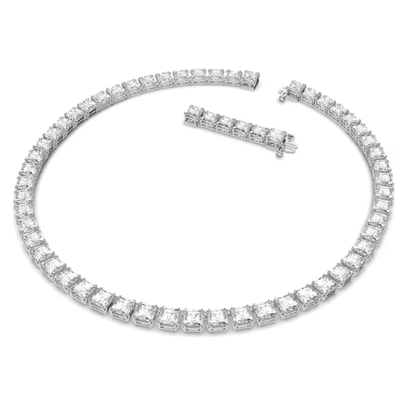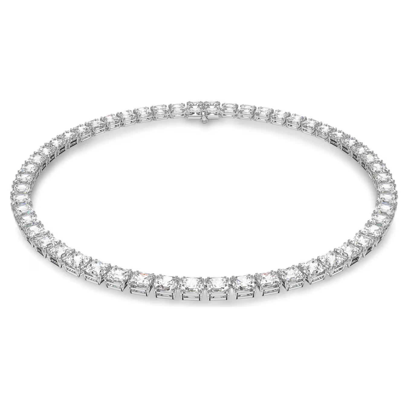 Swarovski Matrix Tennis necklace offers timeless elegance with its quietly glittering design. It features precisely cut square clear crystals set within sleek rhodium-plated settings. This refined piece seamlessly transitions from casual daytime attire to sophisticated evening wear, enhancing any ensemble with a touch of glamour. The necklace secures with an innovative W hook closure and a safety chain for reliable wear.