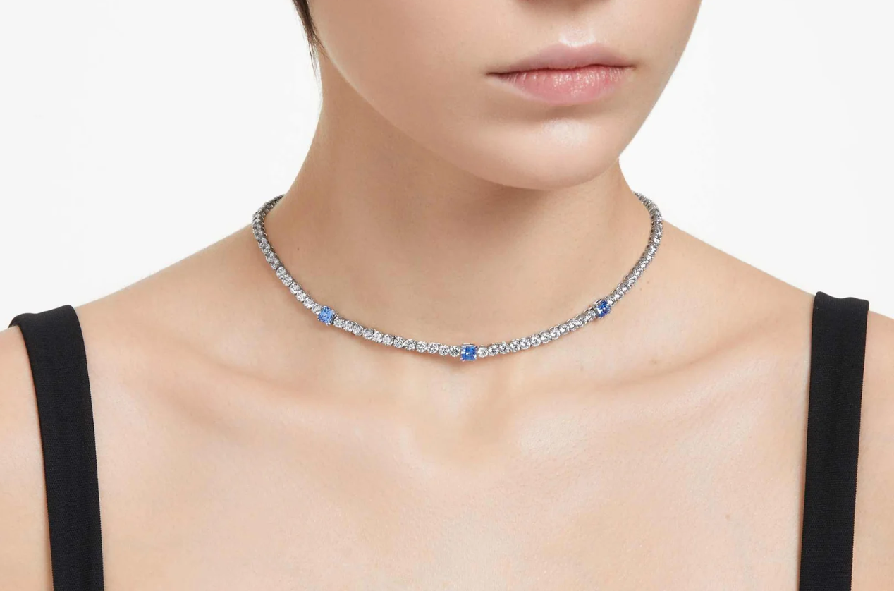 Swarovski Matrix Tennis necklace Mixed cuts, Blue, Rhodium plated. Combining classic elegance with a contemporary twist, this Matrix tennis necklace is both refined and luxurious. An all-around design of clear round stones is interjected by rectangular stones in blue, illuminated by a rhodium plated setting. This piece will add instant glamour to any celebratory look as well making a memorable gift.