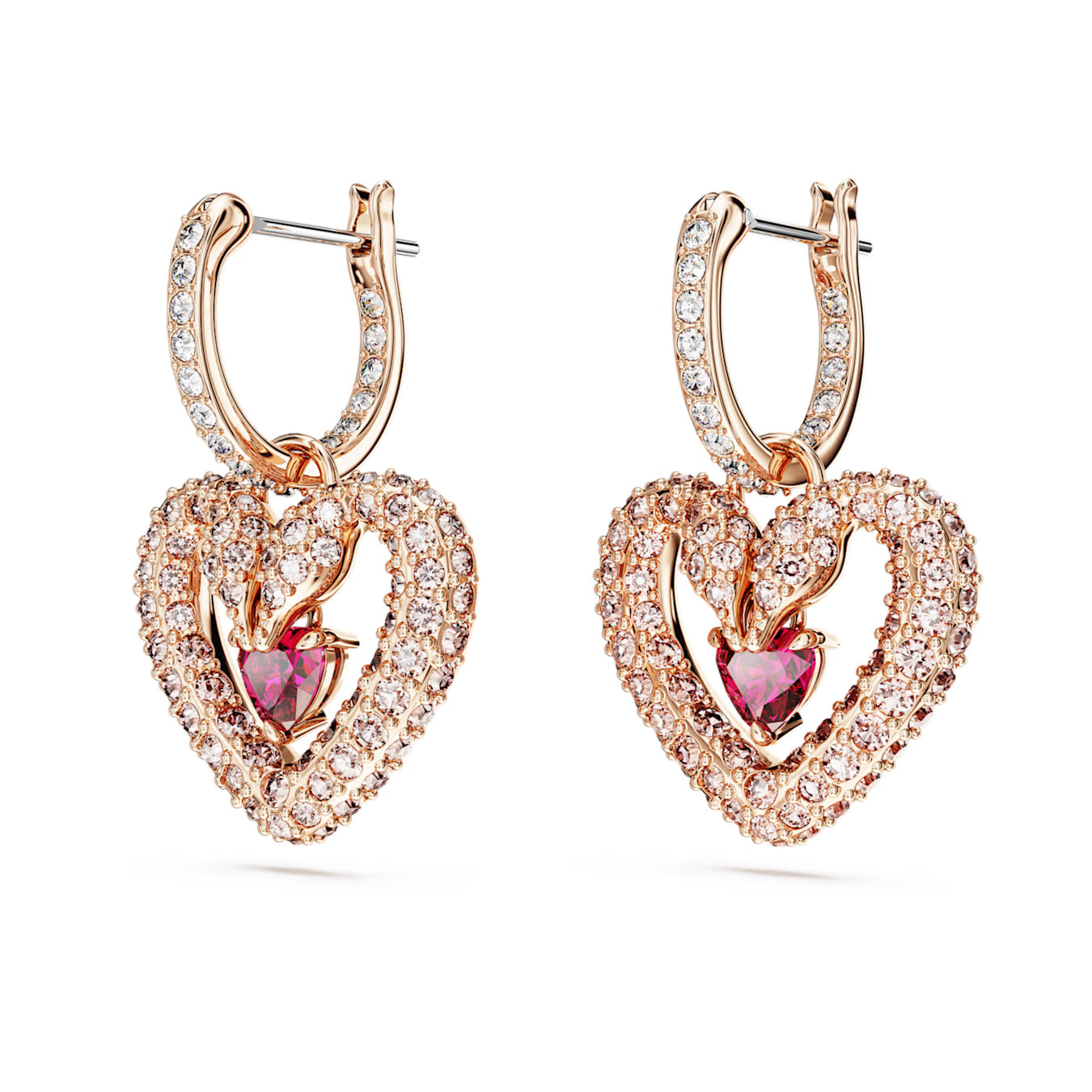 Swarovski  captivating mini hoop earrings. Their romantic motif is crafted from two Swarovski swans joining together to form a radiant heart shape. These earrings are embellished with a pavé of clear crystals and a single pink heart-shaped center stone. Pair these rose gold-tone plated earrings with a matching necklace to celebrate eternal love.