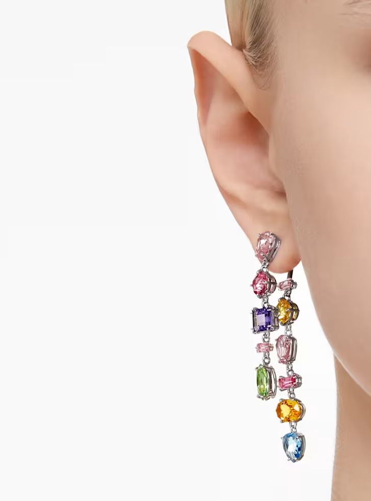 Swarovski vibrant drop earrings exemplify the Gema family's distinctive aesthetic. Each ear features two asymmetrical strands, meticulously adorned with a diverse array of colorful stone cuts. The rhodium-plated setting enhances their brilliance and durability. Complement these earrings with a matching Gema necklace or bracelet to elevate your ensemble with luxurious crystal accents.