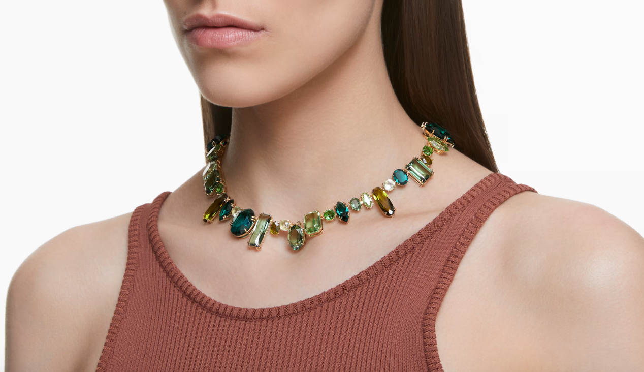 This Gema necklace features an array of mixed-cut green crystals set in a radiant gold-tone plated setting. It showcases Swarovski's unique mastery of crystals, offering a sophisticated and eye-catching design. The necklace is expertly crafted with a secure lobster clasp. This elegant piece provides an instant touch of glamour to any ensemble.