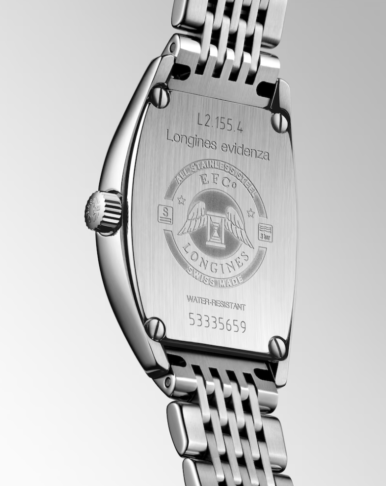 Balancing vintage charm and modern elegance, the Evidenza L2.155.4.71.6 revives the Art Deco spirit with its distinctive tonneau-shaped 26 × 30.60 mm stainless steel case. A refined silver dial features painted Roman numerals, feuille-style hands, and a discreet date window at 6 o’clock. The sapphire crystal with internal anti-reflective treatment ensures clarity, while the stainless-steel bracelet with triple-safety folding clasp adds refined comfort. Powered by Longines’ quartz Caliber L152—with date, seconds, and end-of-life (E.O.L.) indicator—it marries precision with classic appeal