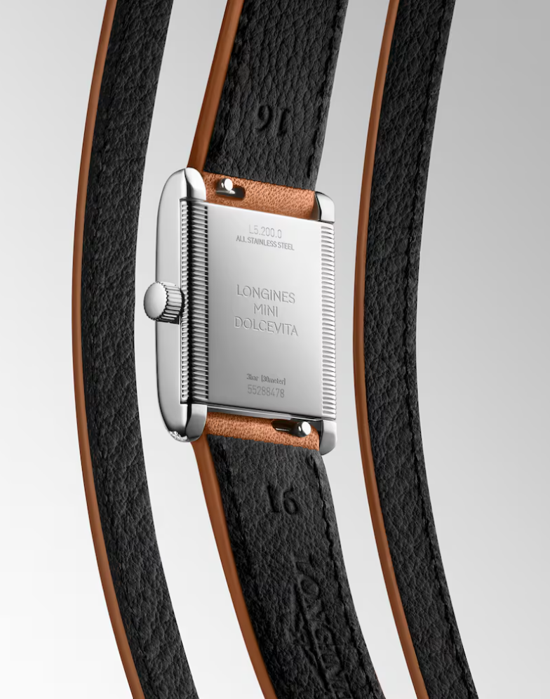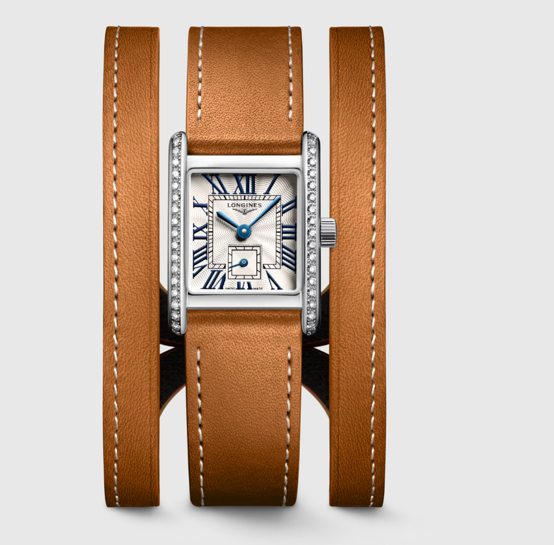 Embodying chic, understated elegance, the Mini DolceVita L5.200.0.71.0 features a sleek 21.5 × 29 mm stainless steel case adorned with 38 Top Wesselton IF-VVS diamonds (~0.456 ct). Its silver flinqué dial hosts painted Roman numerals and a small-seconds subdial at 6 o’clock, graced by refined blued-steel hands. Powered by quartz caliber L178—complete with an End‑Of‑Life (E.O.L.) indicator—the watch is protected by sapphire crystal with multi-layer anti-reflective coating and offers 3 bar water resistance. It comes on a beige-gold double-tour Nappa leather strap with a stainless-steel tang buckle and Longines' quick-release system