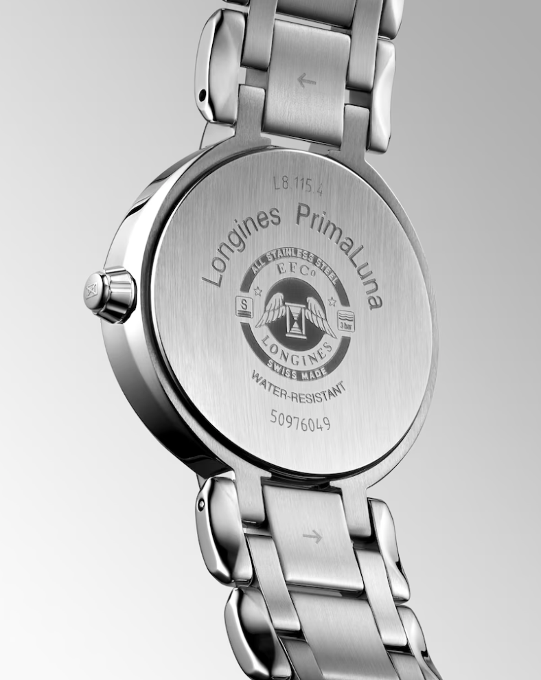 The PrimaLuna Moonphase ref. L8.115.4.87.6 exudes grace and sophistication. It features a 30.5 mm polished stainless steel case with scratch‑resistant sapphire crystal (multi‑layer antireflective), paired with a matching steel bracelet and triple‑safety folding clasp. The exquisite white mother-of-pearl dial is set with 11 Top Wesselton VS‑SI diamonds and blued‑steel hands. A moon‑phase display sits above 6 o’clock, complemented by a date subdial, all powered by the precise quartz caliber L296 with battery EOL indicator