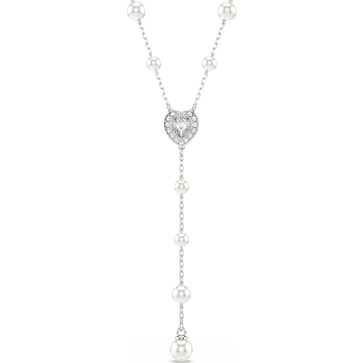 rafted with finesse and timeless beauty, this T-shaped necklace is emblematic of Swarovski’s joyful extravagance. The rhodium plated design features a delicate chain accented with Swarovski Crystal Pearls. A heart-shaped motif is placed at the center and is surrounded by glittering pavé, while the hanging strand provides a final flourish of sophistication. Pair this necklace with other matching jewelry to create your own radiant combinations.