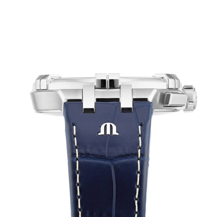 T Maurice Lacroix Aikon Chronograph AI1018‑SS001‑430‑1 blends athletic sophistication with Swiss precision. Encased in a polished and brushed 44 mm stainless-steel case, it frames a rich blue Clous de Paris dial with three chronograph subdials, luminous steel hands, and a date window at 6 o’clock. Powered by a Swiss quartz chronograph calibre, this timepiece offers functionality and finesse, including 100 m water resistance, sapphire crystal with anti-reflective coating, and a secure leather strap with deployant clasp. The result is a bold yet refined statement suitable for both sporty outings and elegant evenings