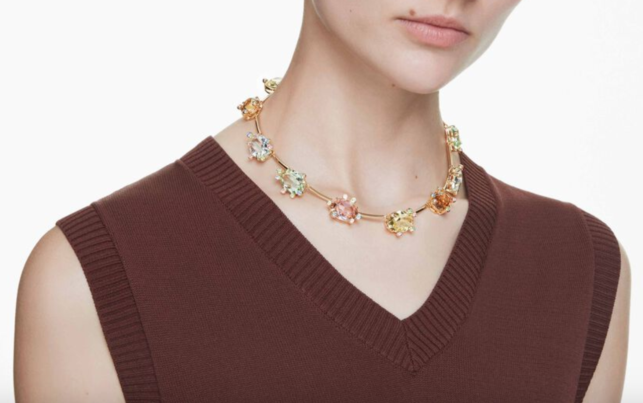Imagination meets wonder in this kaleidoscope of Swarovski color. The gold-tone plated necklace features a full surround of large crystals in multiple vibrant hues, each surrounded by smaller crystals in a joyful bubble prong setting. The effect is effervescent, giving you a mood-boosting piece of jewelry for everyday wear. Pair this necklace with a matching bracelet to accentuate the joy.