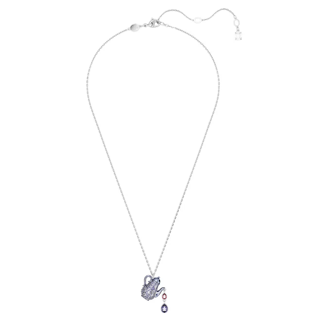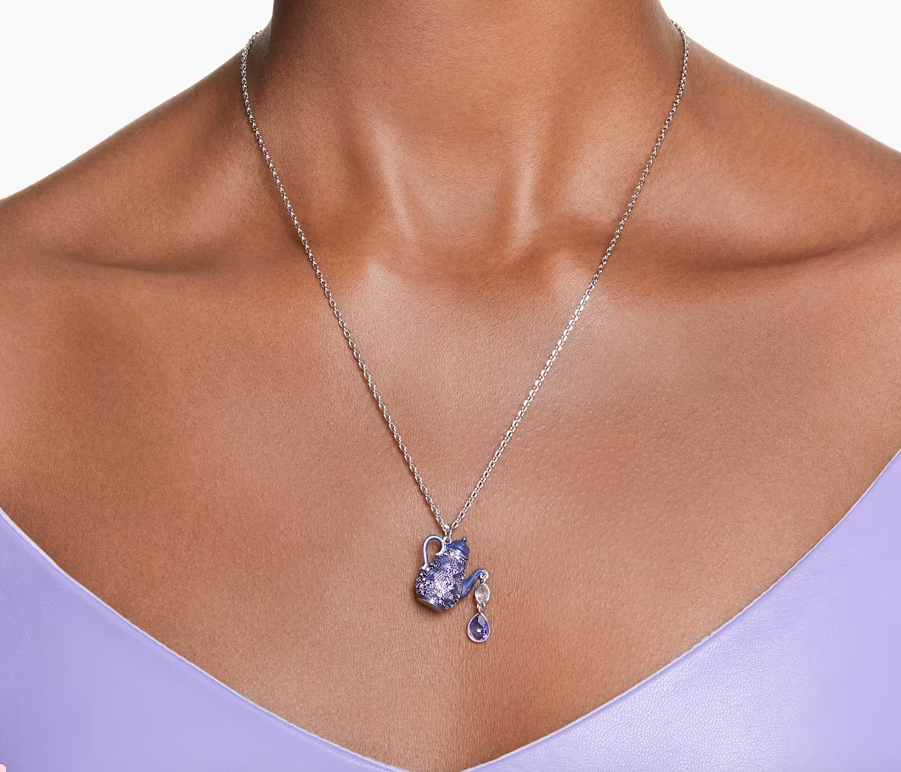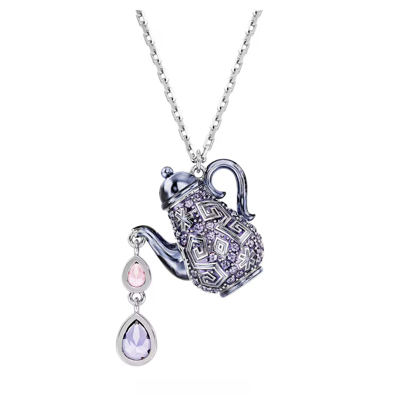 Swarovski inspired by the Mad Hatter’s tea party from Alice in Wonderland, this bright pendant is full of imagination. The rhodium-plated design features a purple tipping teapot, which magically pours two pear-shaped crystals. Worn on a delicate chain, the piece includes an elongation with a single Swarovski Zirconia. This piece offers a sophisticated way to express one's playful side.