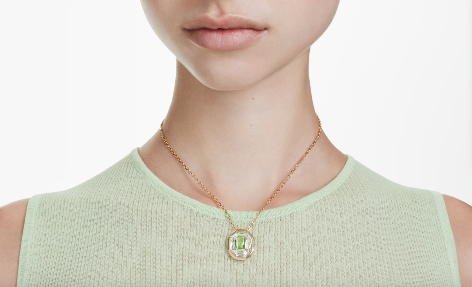 This expressive Chroma jewelry pendant features an octagon-shaped motif, suspended from a delicate gold-tone plated chain. A vibrant green crystal is elegantly stacked atop a larger clear crystal. This timeless piece offers vivid light and adds originality to any ensemble. It is an ideal accessory for enhancing personal style.