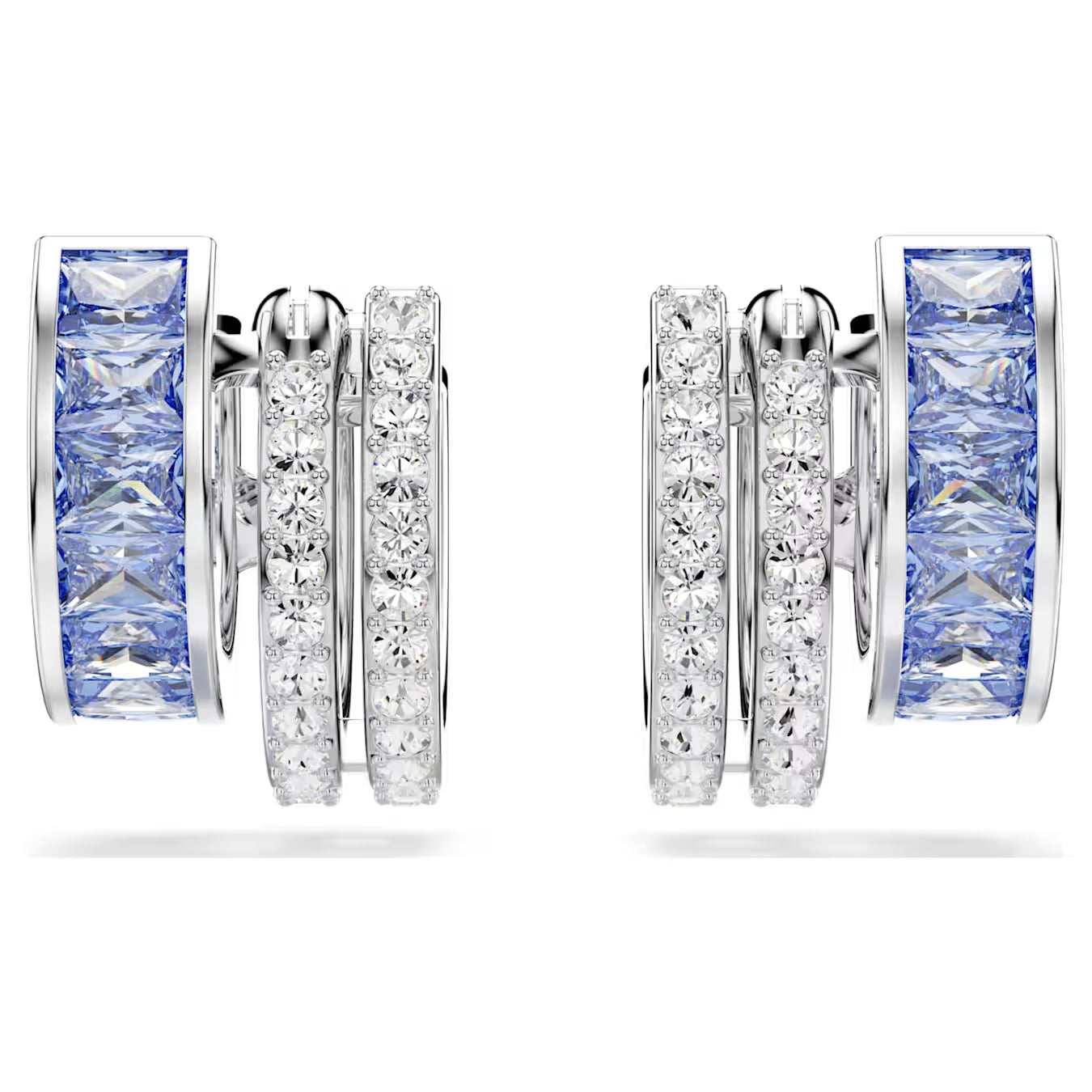 Swarovski  Connexus hoop earrings showcase a dazzling blend of color and sophisticated design. Each rhodium-plated hoop features blue baguette-cut Swarovski Zirconia alongside a double row of clear pavé crystals. The intricate detailing creates a harmonious and refined aesthetic. These earrings are an ideal selection for a distinguished gift.