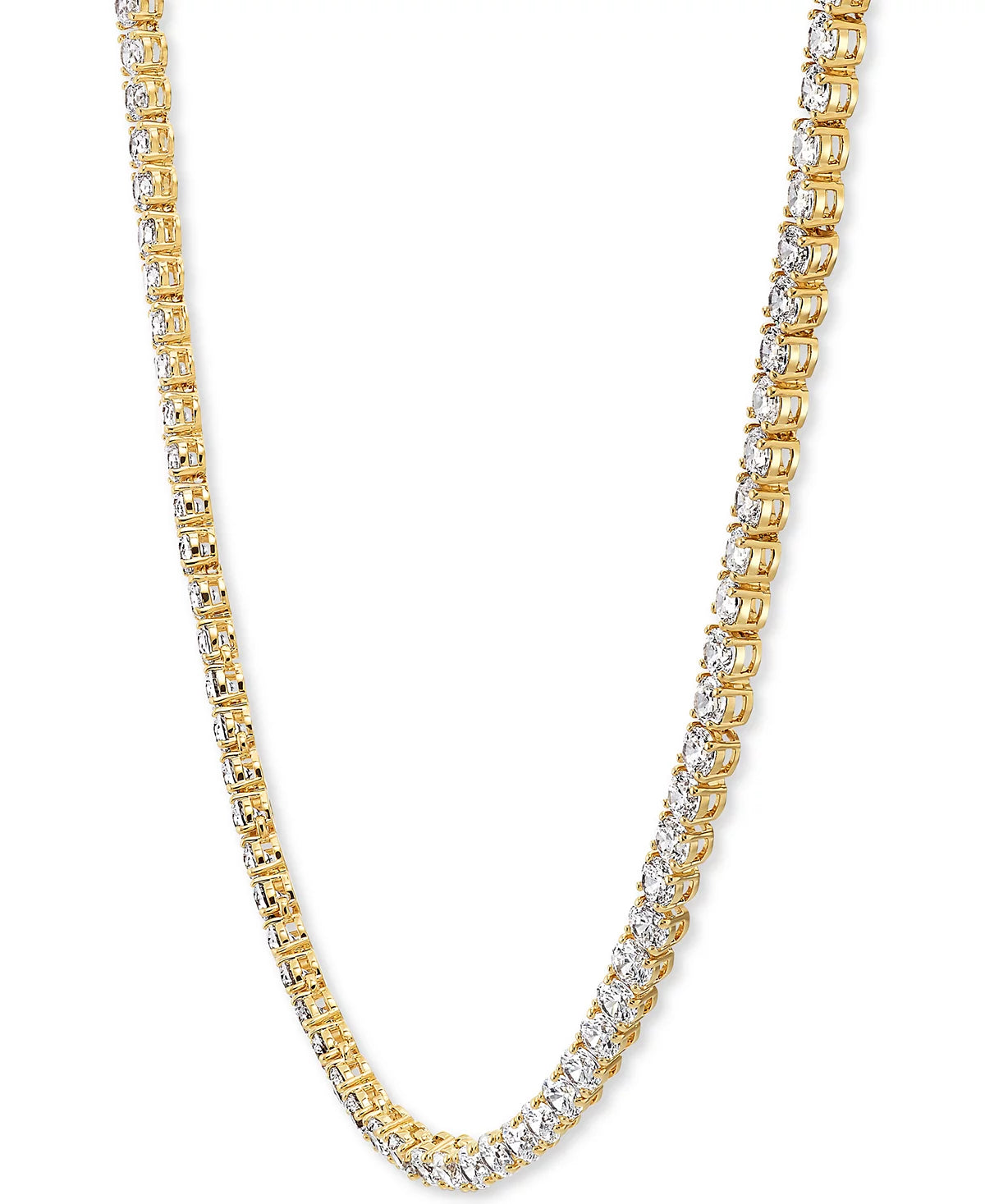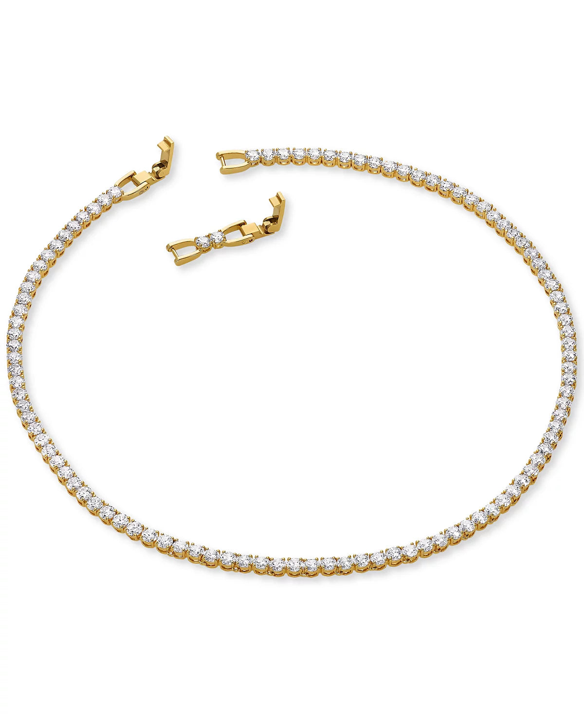 Swarovski tennis necklace features a glamorous design, drawing inspiration from the brand's distinguished bracelet collection. It showcases an array of brilliant crystals meticulously set in a radiant gold-tone mixed metal. The necklace is designed for elegance and versatility, perfect for enhancing any formal or casual ensemble. A secure foldover clasp ensures comfortable wear and lasting appeal.
