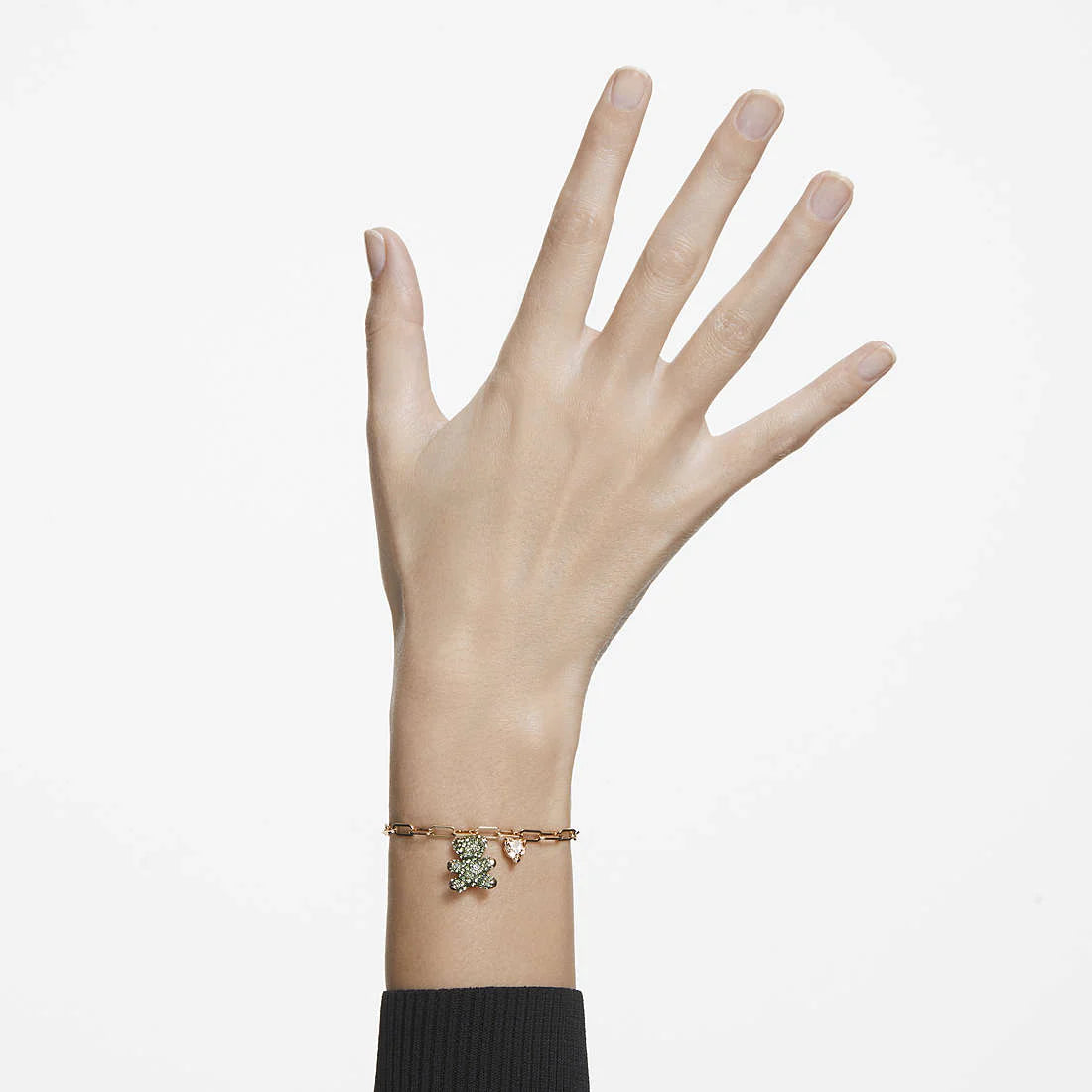 Swarovski gold-plated bracelet features a playful teddy bear motif adorned with a sparkling green Swarovski crystal. A bright yellow heart charm adds a cheerful accent that lifts the spirit. Crafted with high-quality materials, the piece offers a refined finish and adjustable length for comfortable wear. Ideal for gifting or elevating everyday elegance.