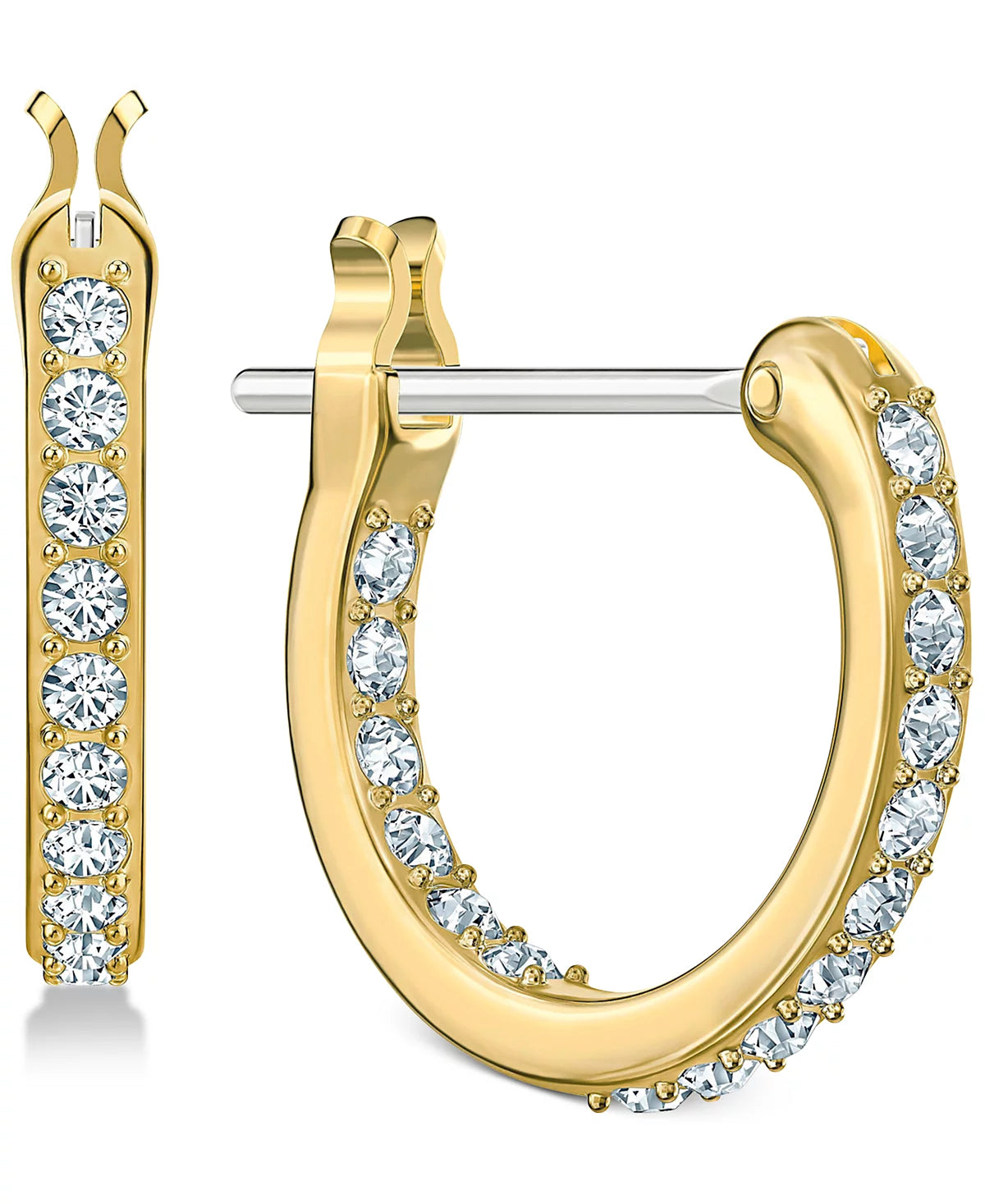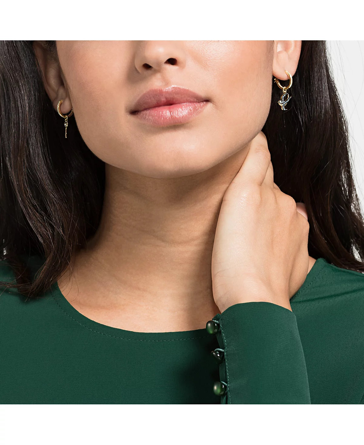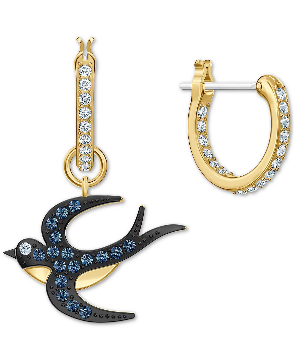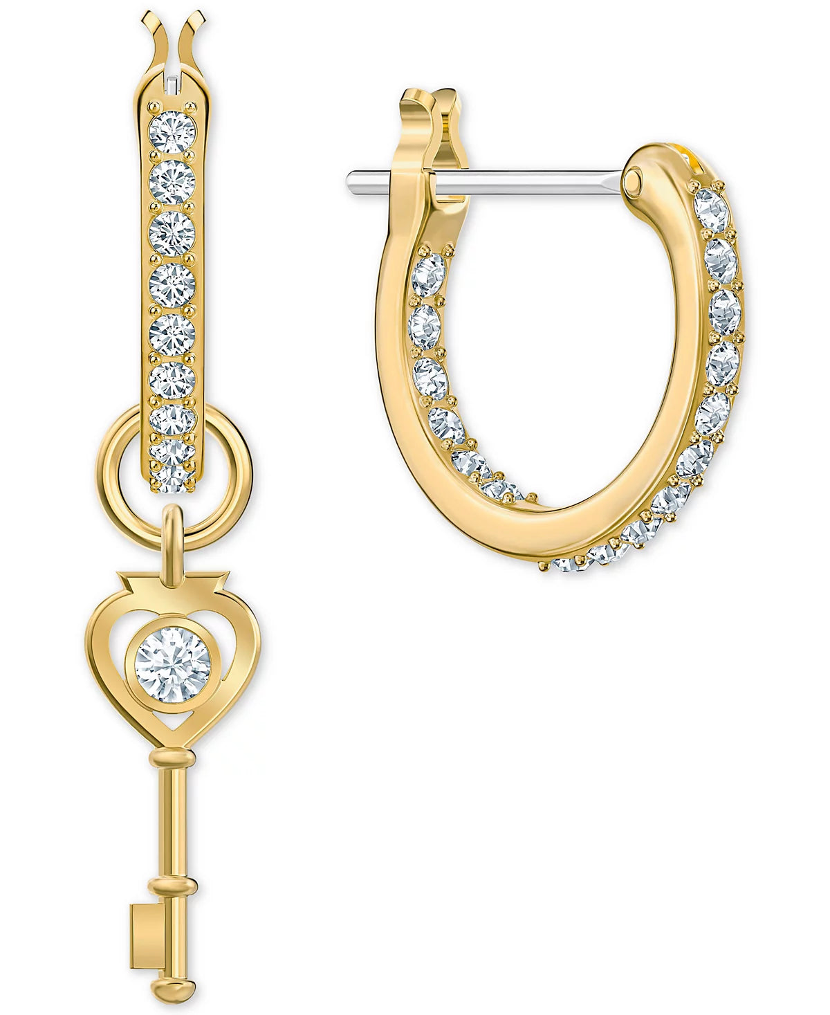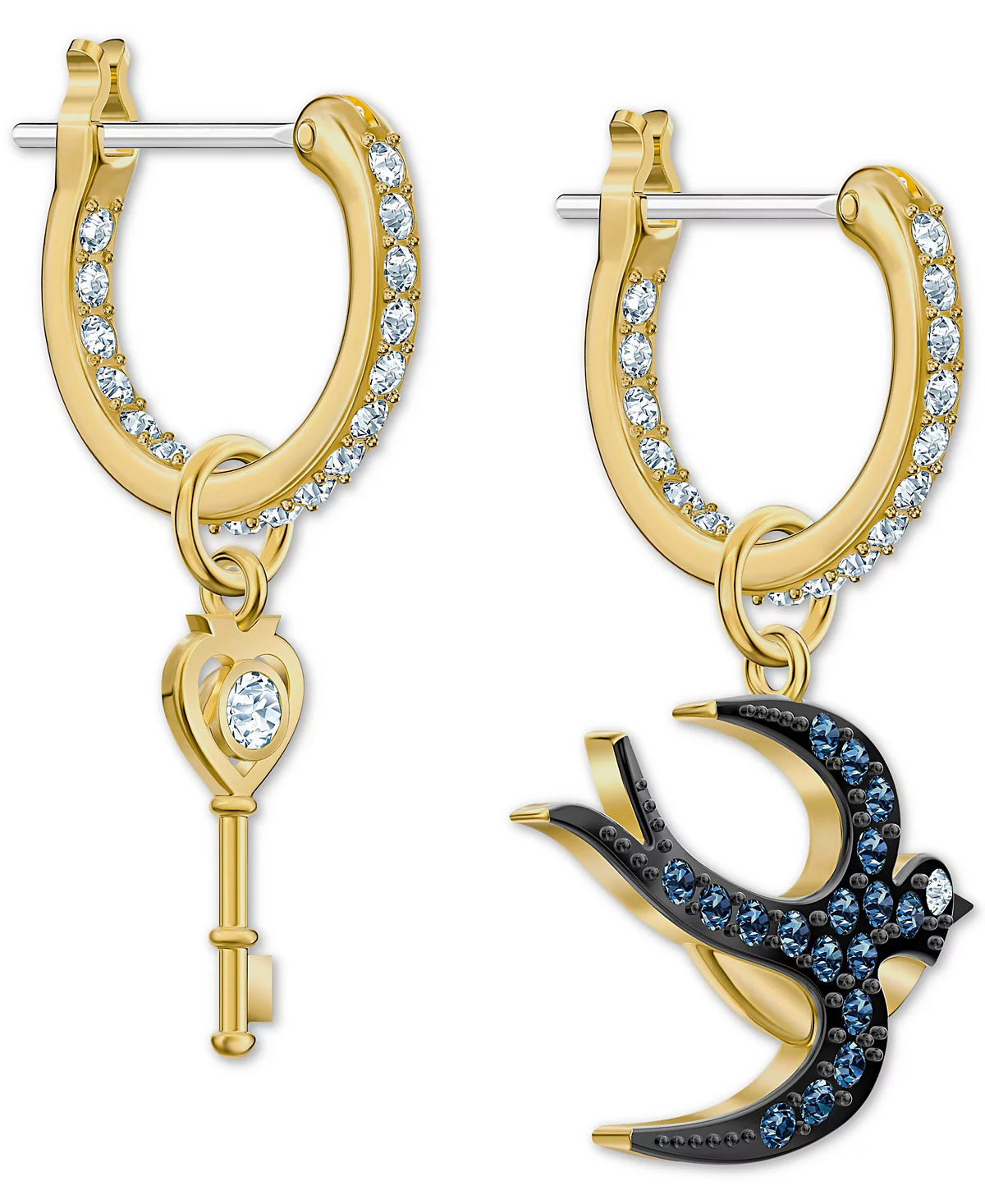 Swarovski earrings feature a unique mismatched design, showcasing a crystal pavé bird and a key. Crafted from gold-tone mixed metal, they offer a touch of mystic elegance to any ensemble. The meticulous detailing enhances their luxurious appeal. These stylish drop hoop earrings are secured with a reliable click-top closure.