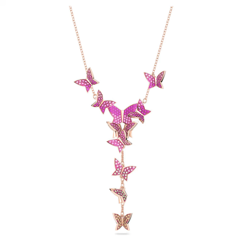 Swarovski Idyllia Lilia Y-shaped necklace enhances everyday elegance with a touch of glamorous femininity. Crafted with rose gold-tone plating, it showcases delicate butterfly motifs. Each butterfly is adorned with shimmering pink pavé crystals, ensuring a captivating sparkle. This versatile piece complements both casual and sophisticated attire.
