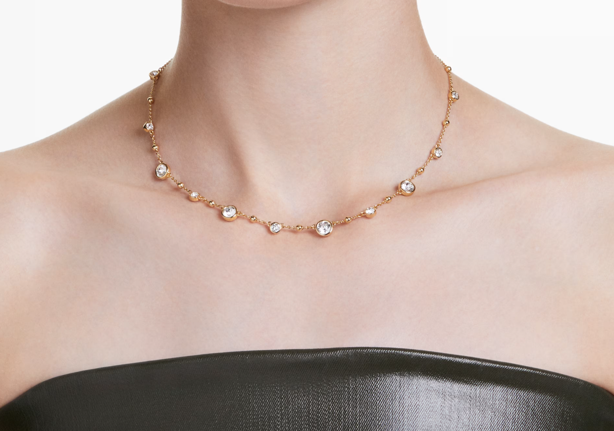 Swarovski necklace from the Imber family presents a radiant design for daily wear. It features a gold-tone plated chain, meticulously accented with shiny metal droplets and brilliant round-cut crystals set in a puffy bezel. A singular Swarovski Zirconia enhances the elongation, adding a touch of refined luxury. This versatile piece can be layered to create diverse and elegant style combinations.