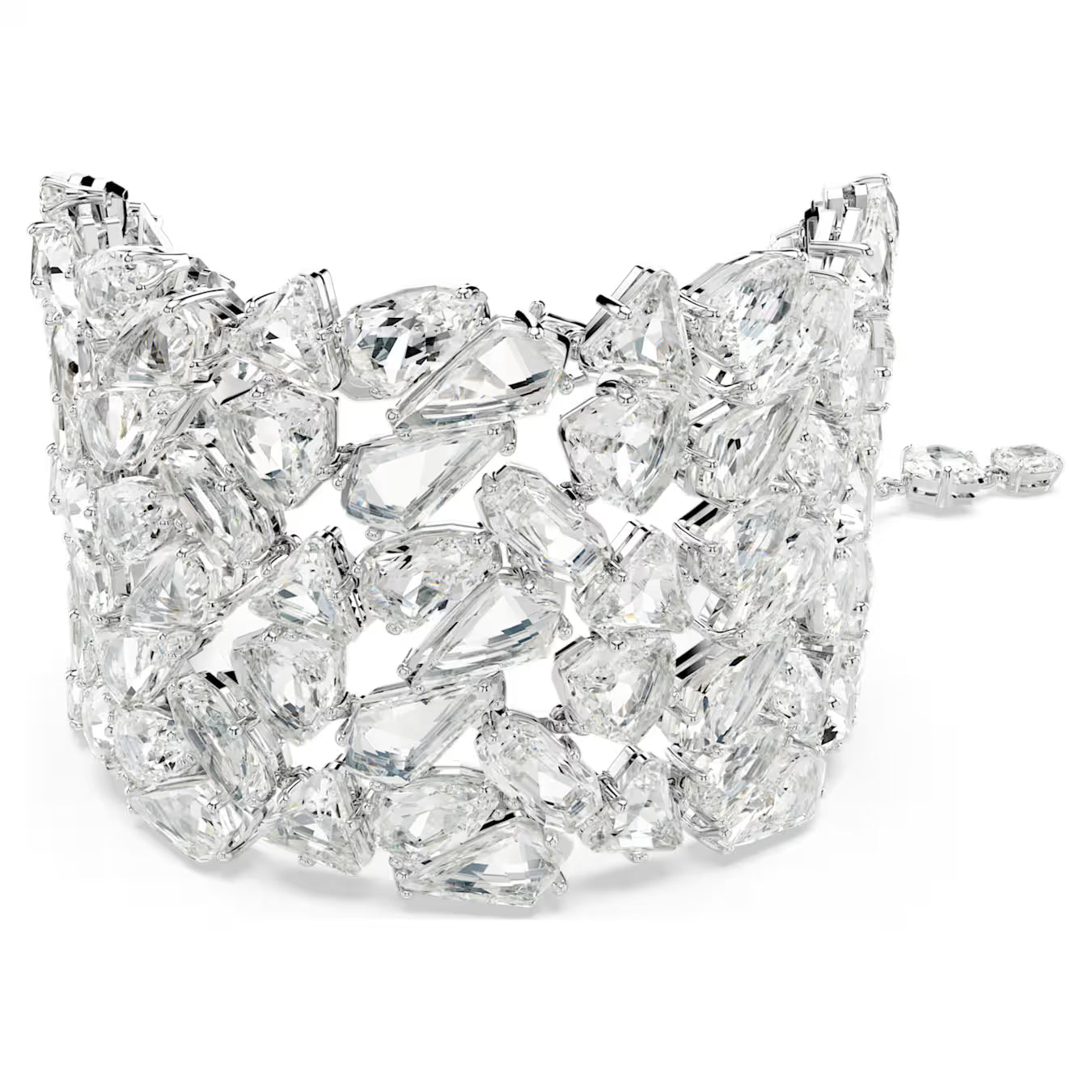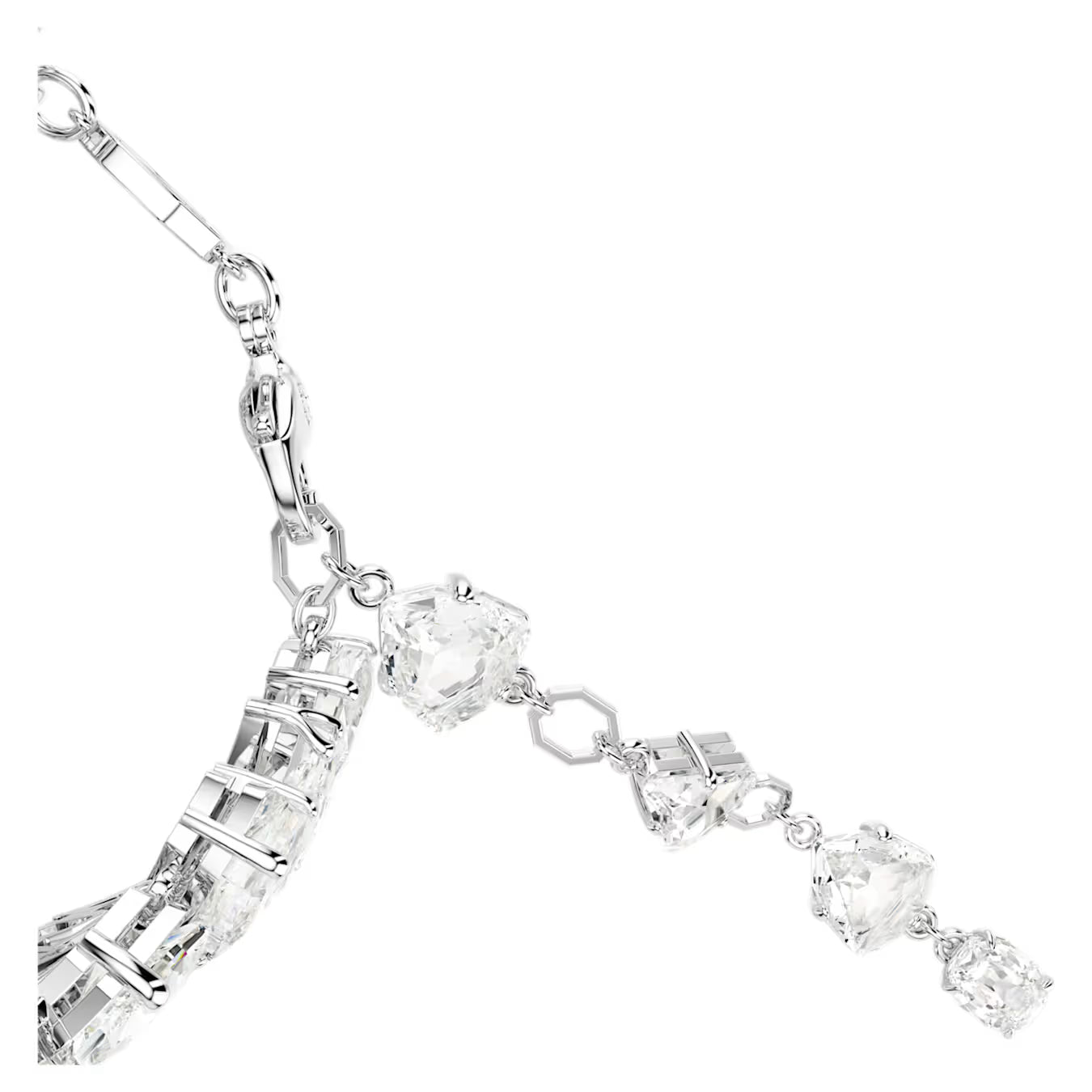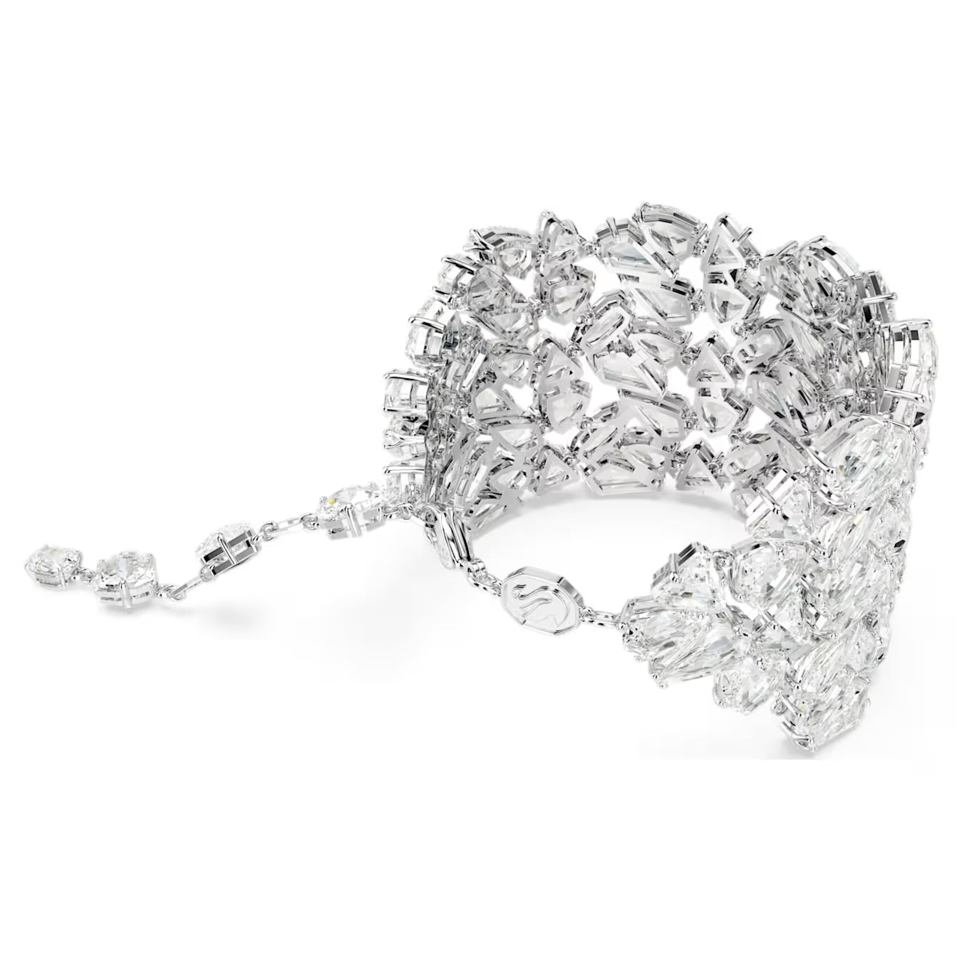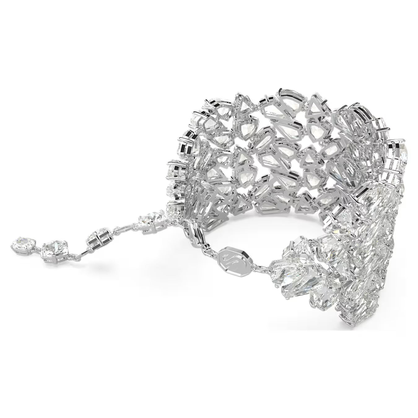 Swarovski extraordinary Mesmera bracelet is a statement piece that will instantly elevate your evening style. The bold design is rhodium plated and features an eye-catching cluster of crystals in a dramatic variety of cuts. For added luxury, the hanging elongation includes individual Swarovski Zirconia between each octagonal link. With so many facets on display, this piece catches the light from every angle. Choose this bracelet as the ultimate expression of refinement.