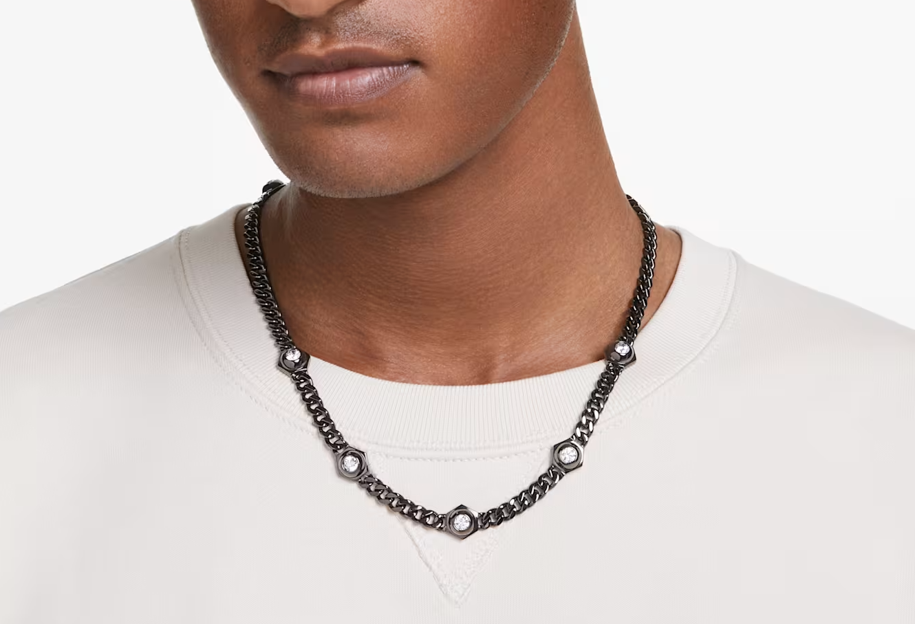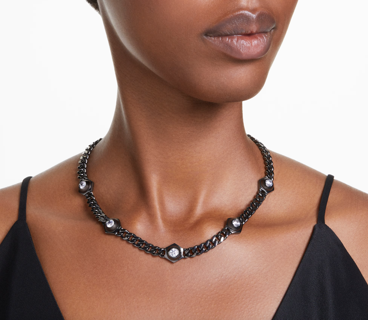 Swarovski Numina necklace offers radiant glamour combined with sophisticated metallic engineering. It features a robust, ruthenium-plated linked chain, meticulously illuminated with clear, round Swarovski Zirconia set within hexagonal bezels. An additional Swarovski Zirconia enhances the elongation, providing a striking design element. This industrial-style piece is an ideal choice for a bold and distinctive aesthetic.