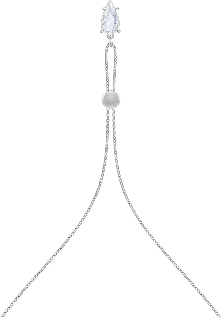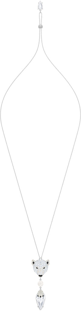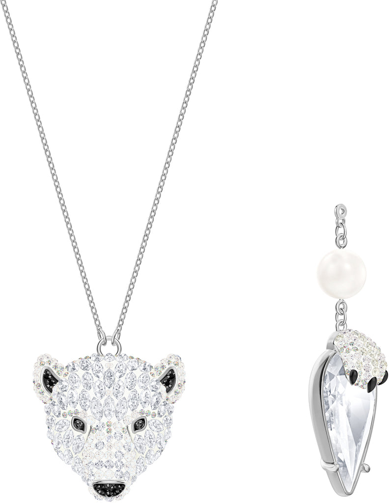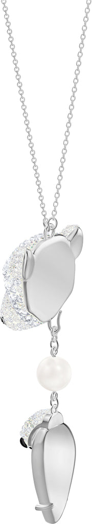 Swarovski Polar Bestiary pendant features a meticulously crafted polar bear motif adorned with brilliant crystals. The rhodium-plated metal setting provides a lustrous, durable finish. A delicate faux pearl and a striking transparent crystal drop elegantly complement the design. This piece offers a sophisticated and timeless addition to any jewelry collection.