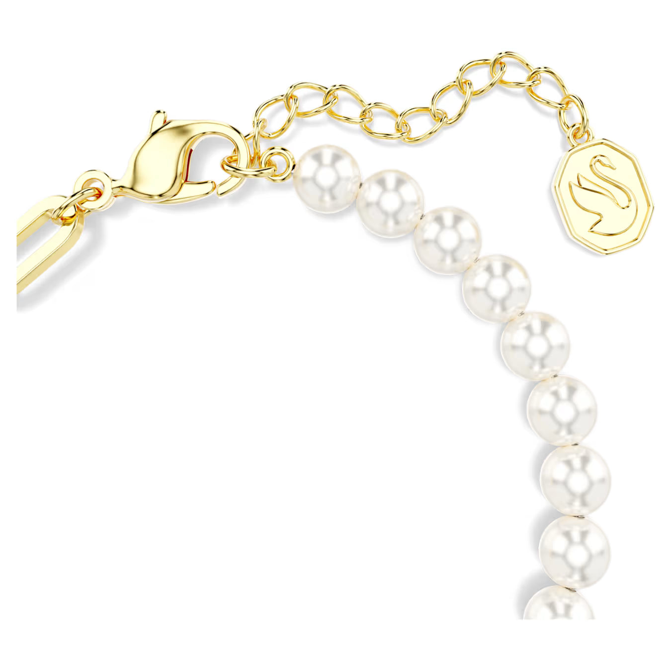 Swarovski bracelet features a charming teddy bear motif, meticulously crafted with lustrous crystal pearls and delicate pink crystal accents. The rose gold-tone plated setting enhances the design's luxurious appeal, offering a sophisticated accessory. This piece combines whimsical charm with refined craftsmanship, making it an ideal gift or personal adornment. Experience the unique blend of playfulness and elegance inherent in this exquisite jewelry.