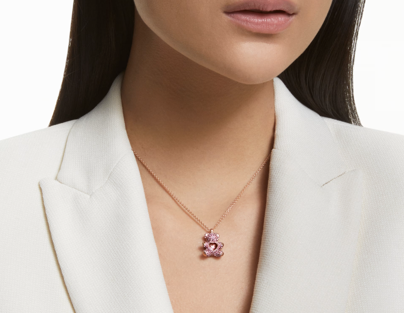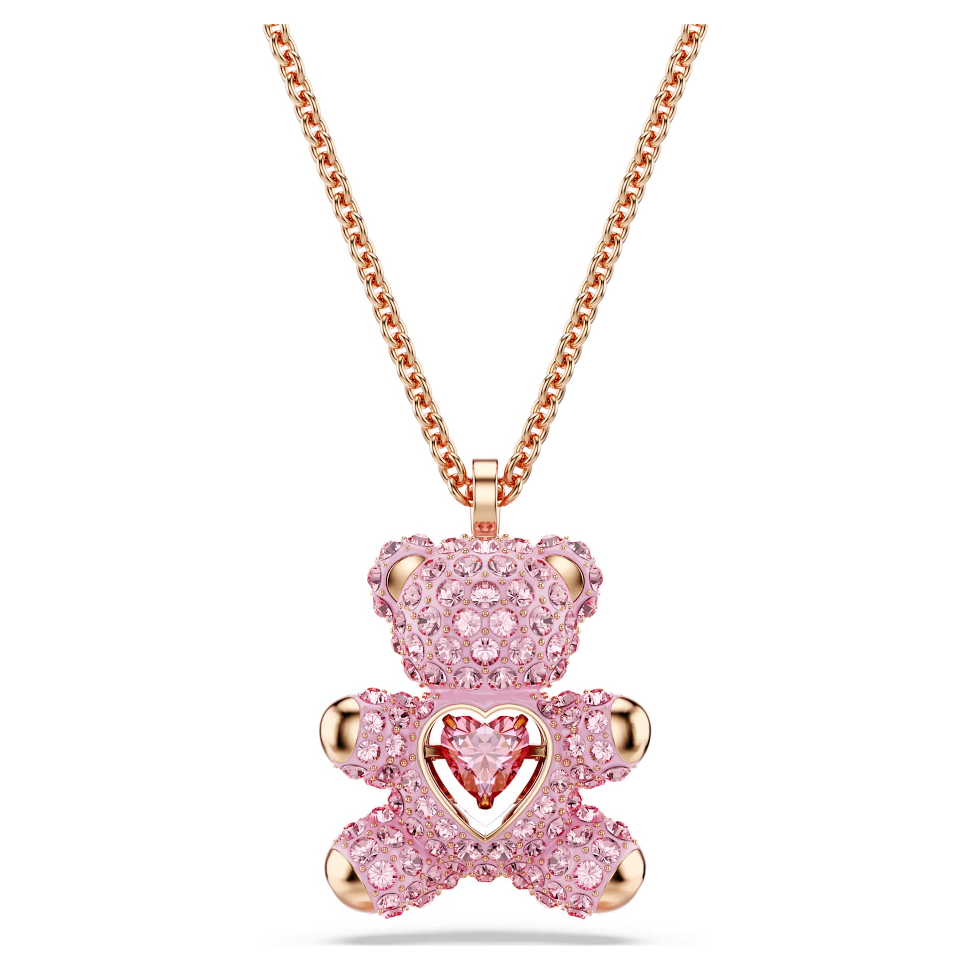 Swarovski Teddy pendant features a charming 3D teddy bear design, meticulously adorned with light pink crystals for a dazzling effect. Crafted with a delicate rose gold-tone plating, it offers a warm and sophisticated aesthetic. The design evokes joy and whimsy, making it an ideal accessory for adding a playful touch to any ensemble. This piece is a testament to precision and artistry, designed for enduring appeal.