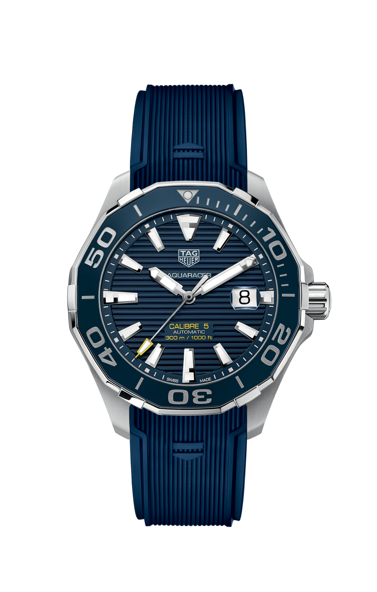The TAG Heuer Aquaracer is a professional diver’s watch that combines bold style with Swiss precision. Its 43 mm stainless-steel case frames a striking blue sunray dial with horizontal streak pattern, luminous hands, indexes, and a magnified date window at 3 o’clock for ultimate legibility. A unidirectional rotating ceramic bezel in blue ensures safe dive timing, while the sapphire crystal offers scratch resistance and clarity. Powered by the TAG Heuer Calibre 5 automatic movement, it delivers robust Swiss performance. The blue rubber strap adds comfort, durability, and a sporty edge. With 300 m water resistance, this Aquaracer is engineered for adventure on land and at sea.
