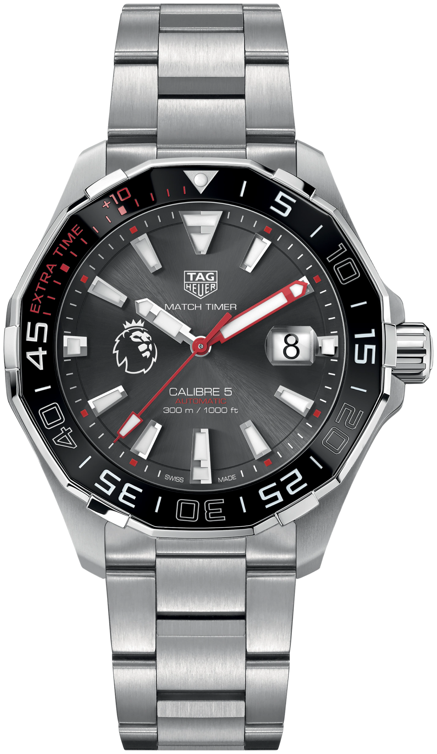 The TAG Heuer Aquaracer is a Special Edition Premier League “Match Timer” that combines professional diving performance with the thrill of world football. Its 43 mm stainless-steel case houses a bold sunray black dial, featuring the Premier League lion logo, luminous markers, and a magnified date display at 3 o’clock. The black unidirectional ceramic bezel includes a unique red “Extra Time +10” marker, highlighting its football-inspired design. Powered by the TAG Heuer Calibre 5 automatic movement, this watch delivers Swiss precision and reliability. The stainless-steel bracelet with safety clasp and diver’s extension ensures comfort and security. With 300 m water resistance, it’s engineered for both underwater exploration and sporting passion.