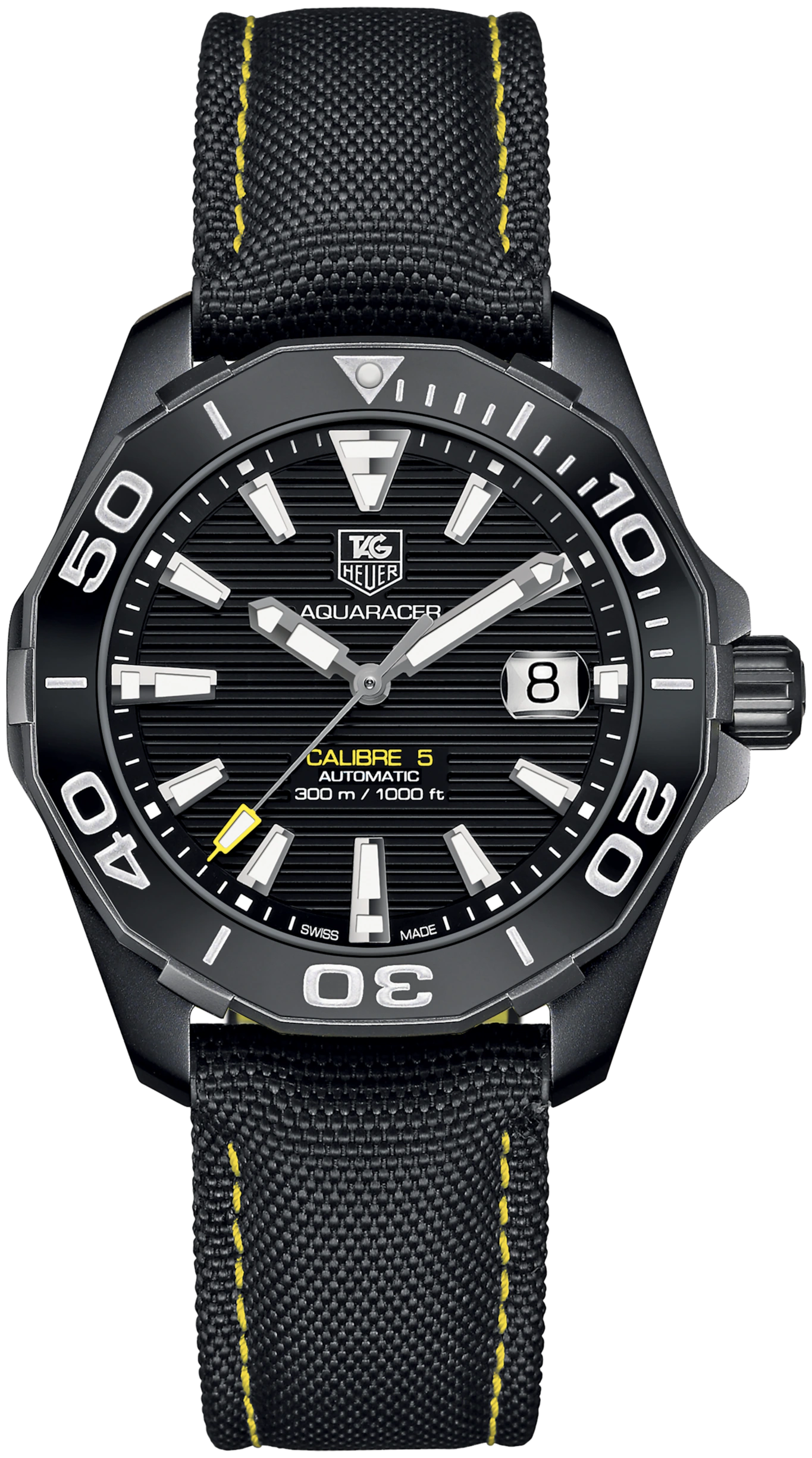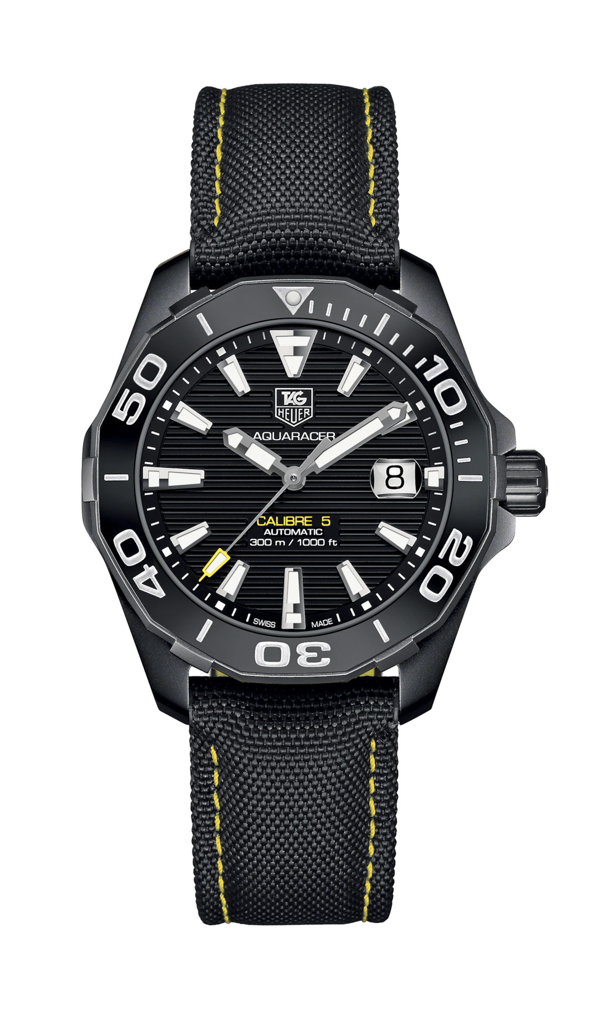 The TAG Heuer Aquaracer is a bold Carbon Edition diver’s watch that fuses strength, style, and Swiss precision. Its lightweight 41 mm titanium case is enhanced with a sleek black PVD finish, while the unique carbon-patterned dial with luminous markers ensures exceptional legibility. Protected by scratch-resistant sapphire crystal and powered by a Swiss automatic movement, this timepiece is built for reliability in all conditions. A black textile strap with neon yellow stitching adds a sporty edge, and with 300 m water resistance, the Aquaracer is engineered for true underwater performance.